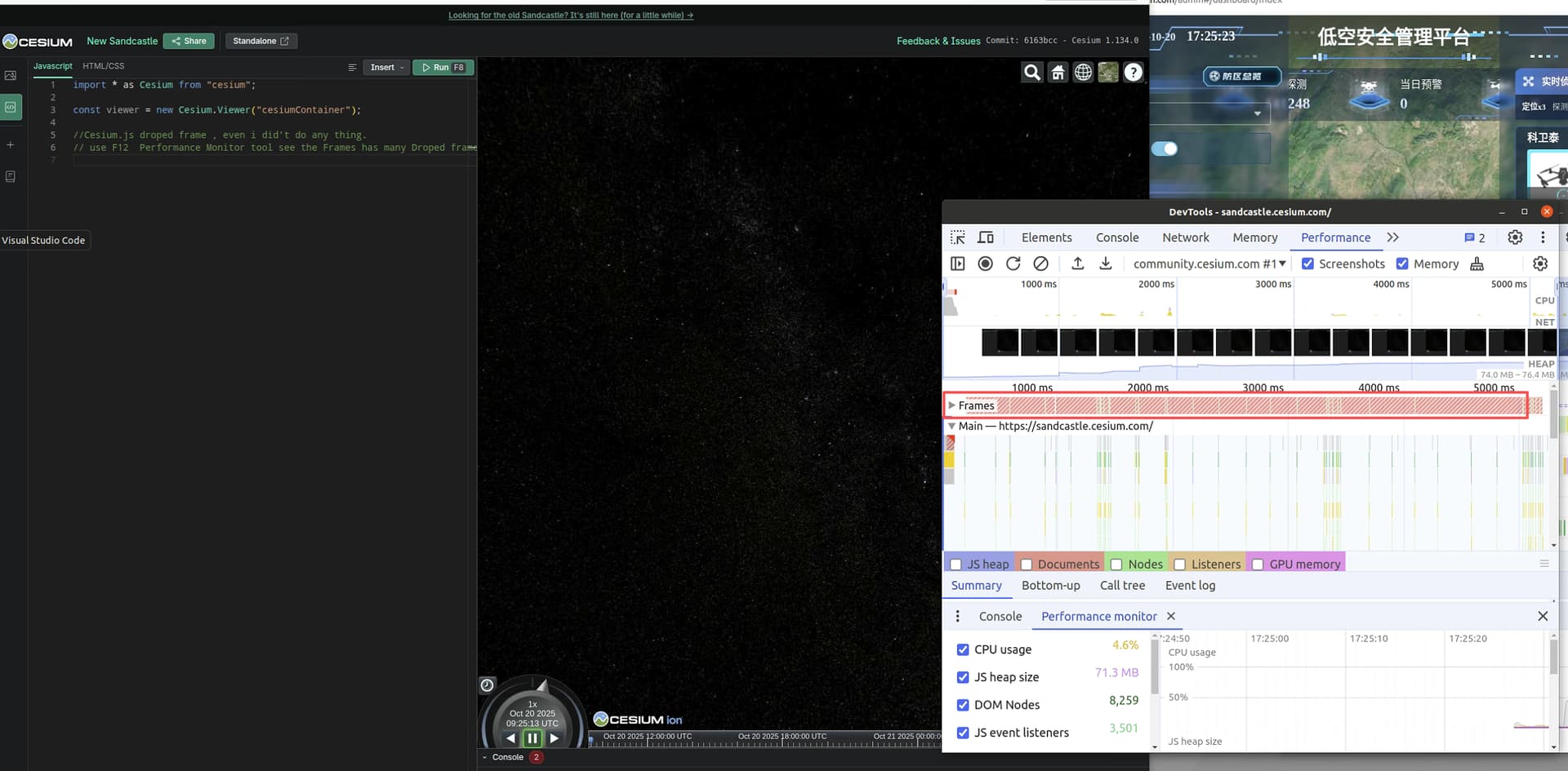 Cesium.js droped frame , even i did’t do any thing. this is Demo.You can use F12 Performance Monitor tool see the Frames has many Droped frame. Please look pictrue,why about this?
