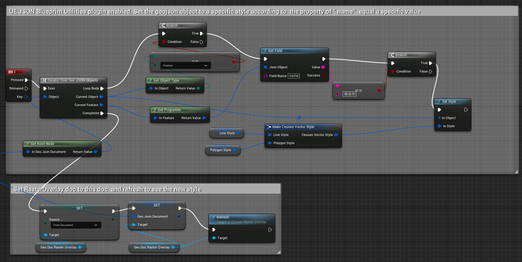 @tyleraa To explain some background behind the above, the current solution for visualizing GeoJSON in Cesium for Unreal is to use a GeoJsonRasterOverlay. This drapes the GeoJSON data over the terrain and has the ability to customize the styling of that data programmatically as described above. Currently, lines and polygons are supported. Points are not directly supported by the GeoJsonRasterOverlay (I’m not entirely clear what a good default path for rasterizing points would be - just as circles?), but you can iterate through the GeoJSON document to find any points and handle them as you’d like. For most users, this seems to be spawning things at those points, such as actors or markers.