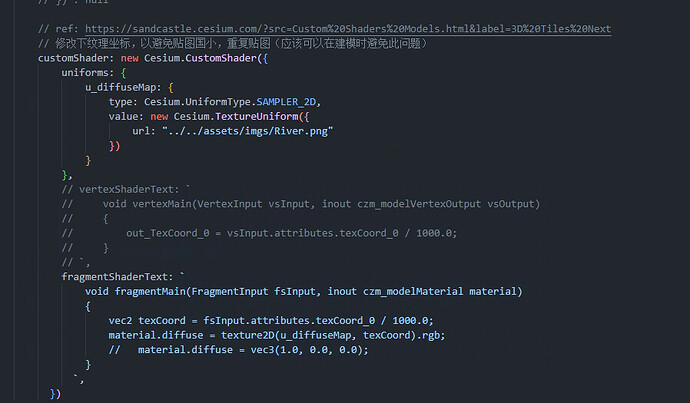 The ‘u_diffuseMap’ variable below is only a test. Because my 3Dtileset has it’s own texture image which are included 3dtiles files. i wonder how to get the cesium’s default 'uniform sampler2D ’ variable in the custom fragment code, but define them in JS code by the object ‘uniforms’.