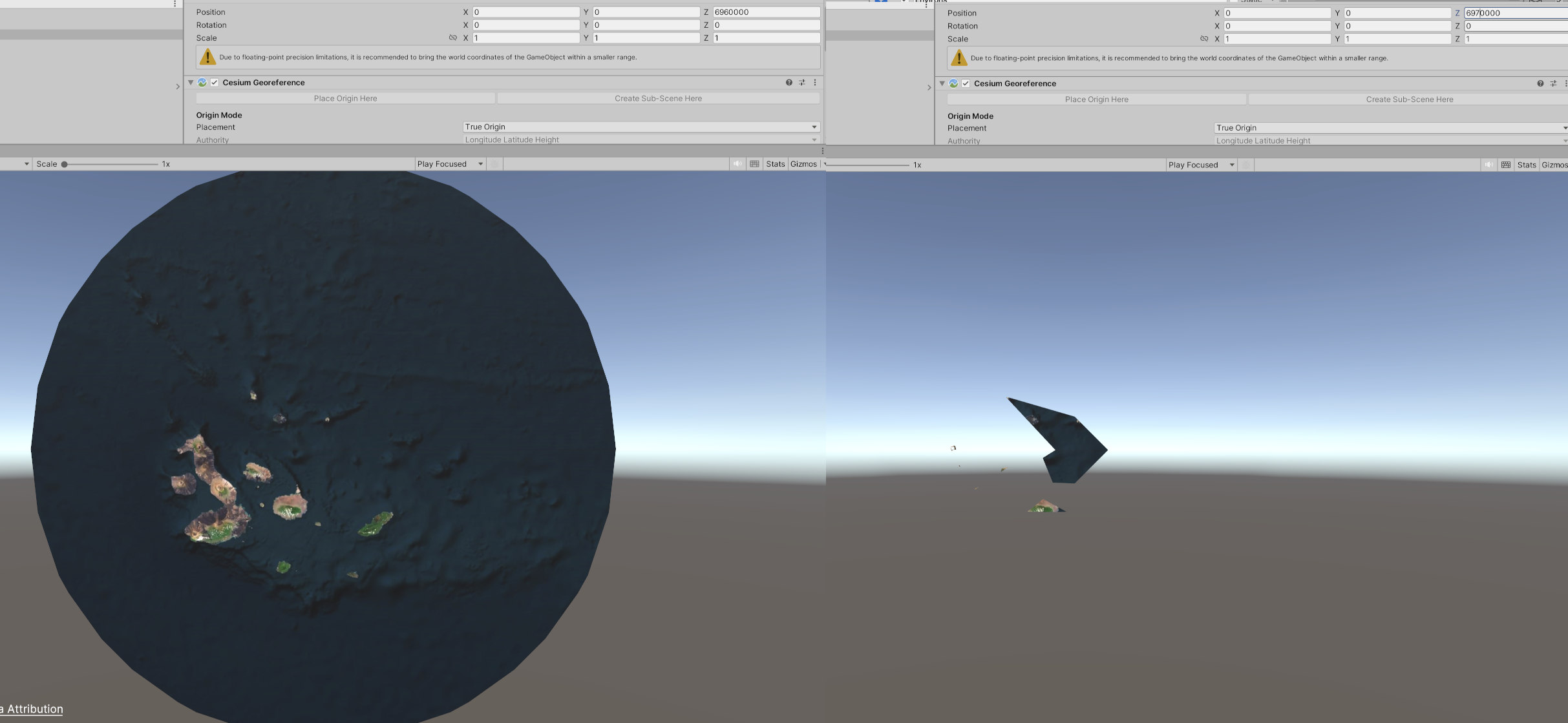 Here are three views from putting the Cesium Earth under a hierarchy and displacing it back from the player/camera. This is with the Geocentric setting.